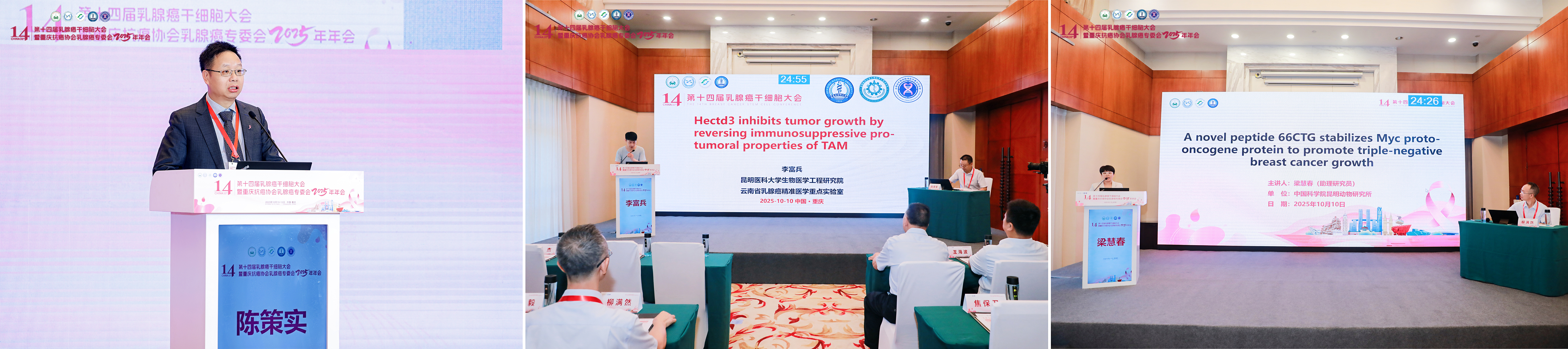 “乳腺癌干细胞大会”由陈策实研究员于2012年发起组织,是乳腺癌基础转化研究领域的重要学术年会,迄今已成功在全国各地举办了十三届。2025年10月10日至12日,第十四届乳腺癌干细胞大会在重庆市胜利召开。本次会议由重庆抗癌协会、重庆市医药生物技术协会主办,重庆医科大学附属第一医院、bat365在线平台、重庆医科大学附属第一医院乳腺甲状腺外科、云南省乳腺癌精准医学重点实验室以及重庆抗癌协会乳腺癌专委会联合承办。大会邀请了重庆医科大学校长张泽民院士、澳门大学邓初夏教授、厦门大学刘文教授、浙江大学张龙教授等100余位国内外知名专家(其中国家级人才40多位)出席会议,吸引了来自全国各地300余名乳腺癌研究领域的专家学者与科研人员参会。bat365在线平台生物医学工程研究院院长、云南省肿瘤医院副院长、云南省乳腺癌精准医学重点实验室主任陈策实研究员和重庆医科大学附属第一医院乳腺甲状腺外科刘胜春主任担任本次大会共同主席。重庆医科大学校长张泽民院士代表学校致辞并做主旨报告。
