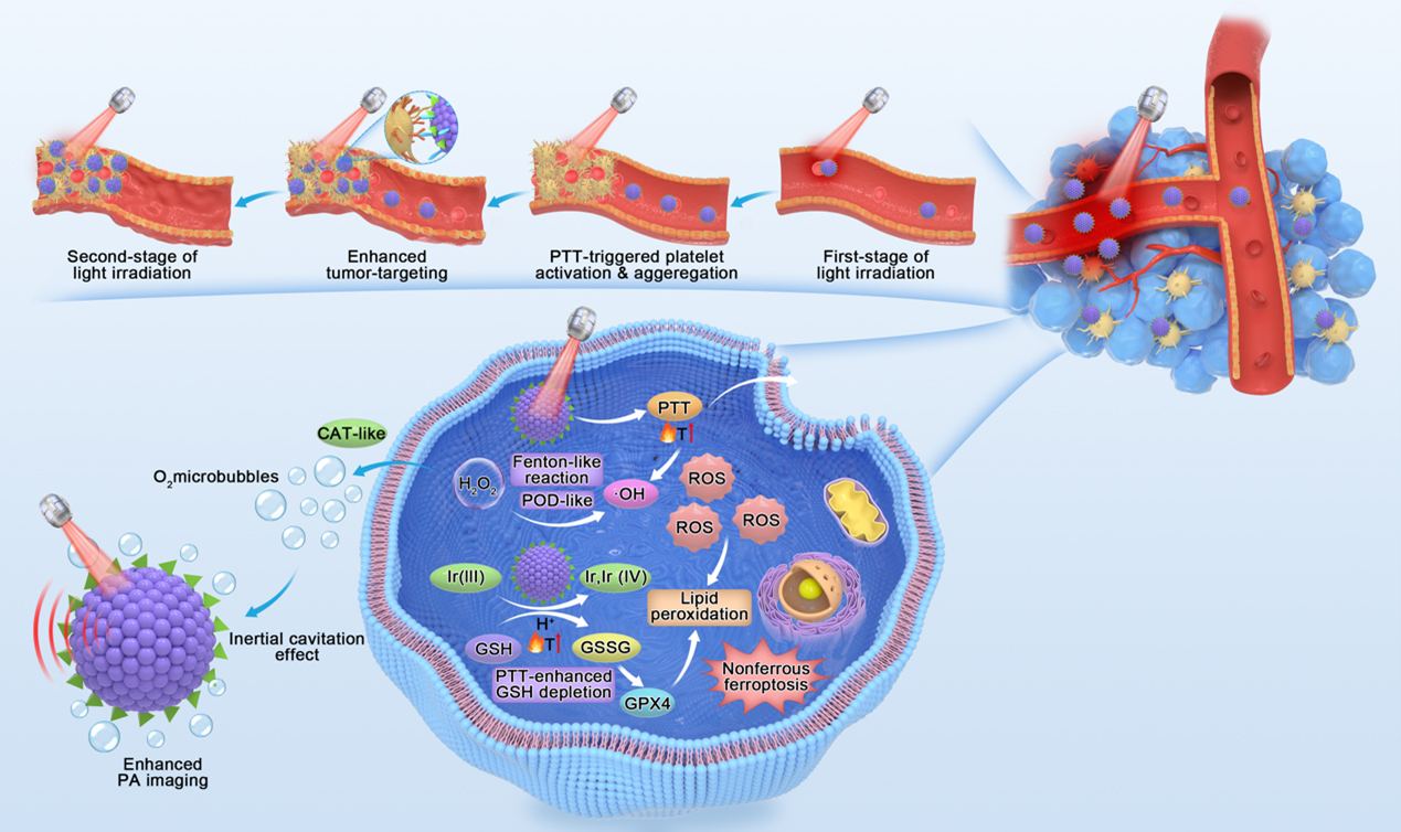 针对这一挑战,陈策实团队朱曦博士构建了具有“光热级联”特性的 IrOx-P 纳米酶,实现了外源光热触发与内源催化反应的双重响应。该纳米酶以氧化铱为核心,既能高效产热又具备氧化还原催化活性,并通过修饰 P-选择素靶向肽,实现对肿瘤的精准识别。静脉给药后,IrOx-P首先依靠肿瘤的高通透性进入病灶区域;在近红外光照下,纳米酶产生局部热效应,不仅直接杀伤肿瘤细胞,还能引发血管轻度损伤和血小板激活,从而促进更多纳米酶再次聚集于肿瘤,形成自我强化的“级联”效应。同时,在肿瘤的酸性和过氧化氢丰富的环境中,IrOx-P 通过Ir3+/Ir4+循环反应显著增强催化效率,持续产生活性氧并耗竭谷胱甘肽,诱导脂质过氧化和铁死亡。外源光热激活与内源催化反应的协同作用,带来了更强的抑瘤效果。动物实验结果证实,该策略能显著抑制肿瘤生长。更重要的是,IrOx-P 还具备优异的光声成像性能,通过催化产氧增强信号,实现了治疗过程的实时监测,为诊疗一体化提供了有力支持。