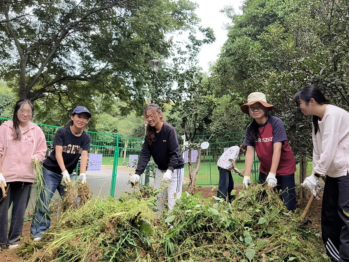 在学习了基本理论知识后,同学们分组投入劳动实践。大家手持工具,有序开展除杂草、清理枯枝等工作。尽管汗水浸湿衣衫,但同学们热情不减,认真细致地完成了每一项任务。劳动间隙,唐老师还向大家介绍了灵芝的现代应用实例,让同学们对灵芝的药用价值有了更深刻的理解。