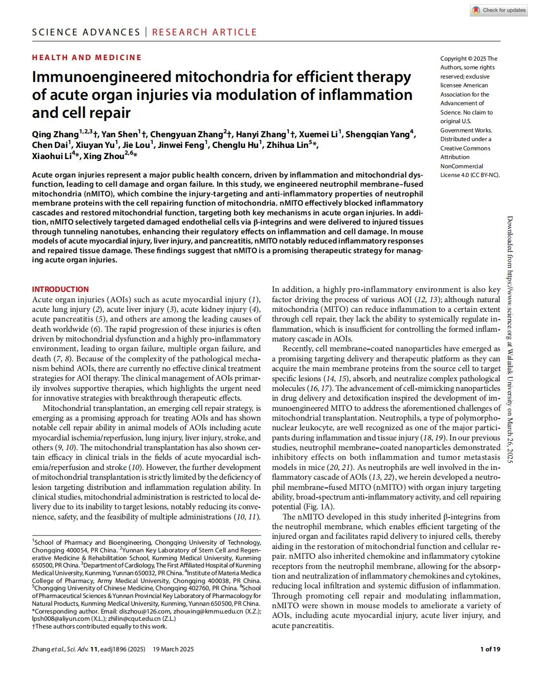 近日,bat365在线平台康复学院(云南省干细胞和再生医学重点实验室)周兴教授团队联合重庆中医药学院、陆军军医大学科研团队,在国际顶级期刊《Science Advances》(中国科学院1区Top,IF=11.7)发表题为《Immunoengineered mitochondria for efficient therapy of acute organ injuries via modulation of inflammation and cell repair》的文章。康复学院教授周兴为论文通讯作者,副教授张成元为第一作者。该研究获国家自然科学基金重点项目资助。