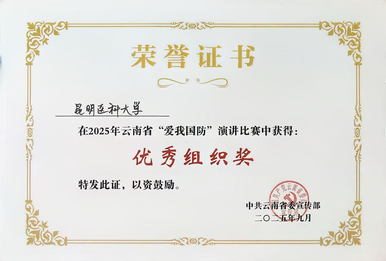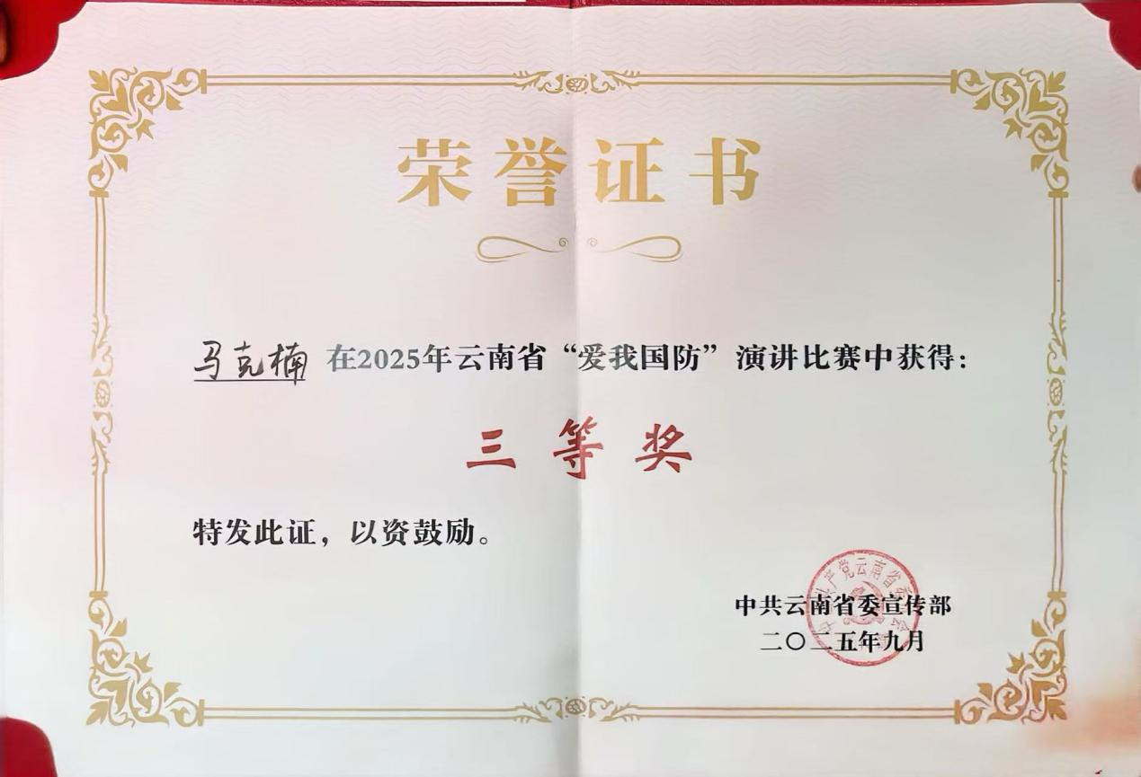 9月5日,由中共云南省委宣传部主办,中共云南省委省直机关工委、中共云南省委教育工委、云南省国资委协办的2025年云南省“爱我国防”演讲比赛决赛在昆明举办。bat365在线平台人文与管理学院马克楠同学获三等奖,学校获优秀组织奖。