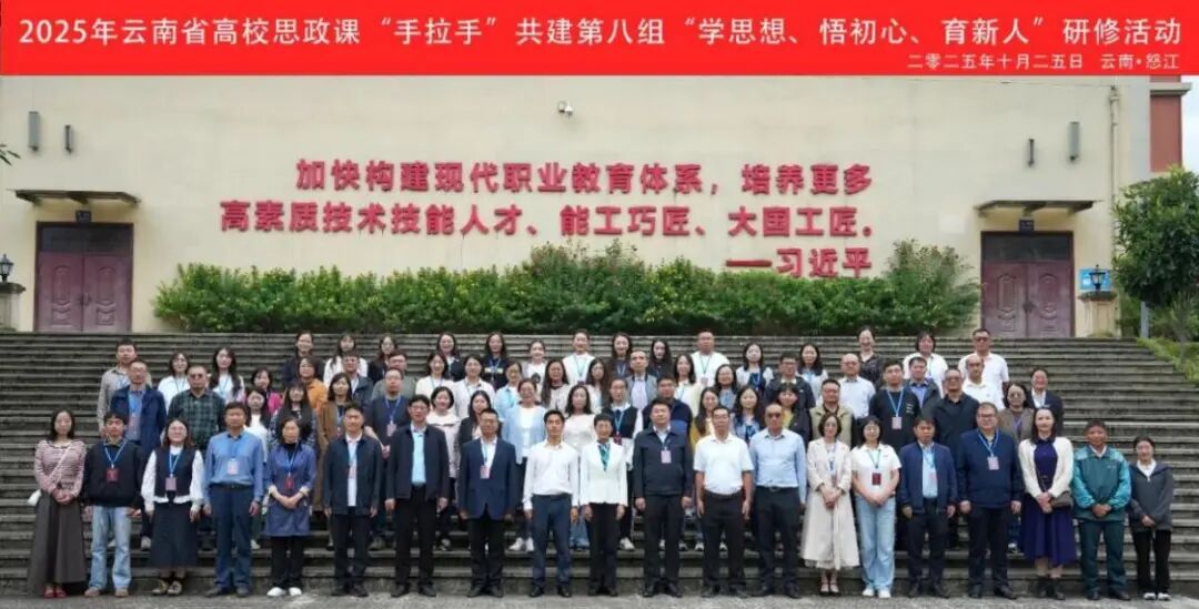 为深入学习贯彻习近平新时代中国特色社会主义思想,全面落实立德树人根本任务,推动全省高校思政课高质量发展,深化大中小学思政课一体化建设,10月24日至25日,由bat365在线平台牵头、怒江职业技术学院承办的云南省高校思政课“手拉手”共建第八组“学思想、悟初心、育新人”主题研修活动在怒江职业技术学院顺利举行。来自全省9所高校的思政课教师代表齐聚怒江,通过专题报告、研讨交流、教学展示、实地考察等形式,共研思政育人新路径,共谋协同创新新发展。