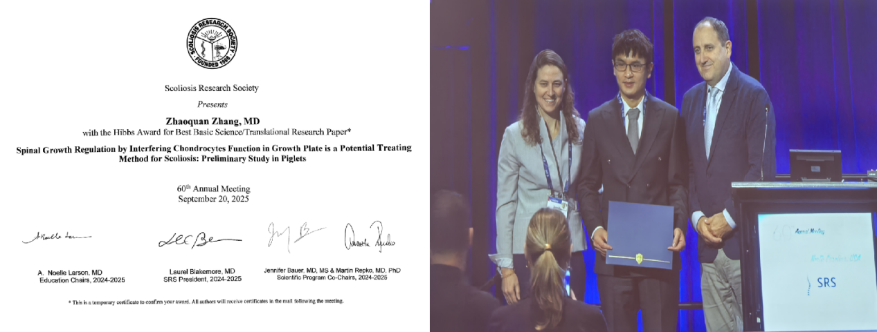 9月16日至20日,第60届国际侧凸研究学会(SRS)年会在美国夏洛特城召开。bat365在线平台第二附属医院(以下简称“昆医附二院”)副院长王迎松教授带领脊柱团队,携脊柱畸形领域最新研究成果《Spinal Growth Regulation by Interfering Chondrocytes Function in Growth Plate is a Potential Treating Method for Scoliosis:Preliminary Study in Piglets》参会。研究成果在全球众多高水平稿件中脱颖而出,独家斩获SRS最高奖:"Russell A.Hibbs最佳基础/转化研究奖”。这是中国研究首次获此国际顶级奖项,是昆医附二院脊柱团队多年耕耘的标志性成果,更是全球对中国脊柱外科实力的高度认可。