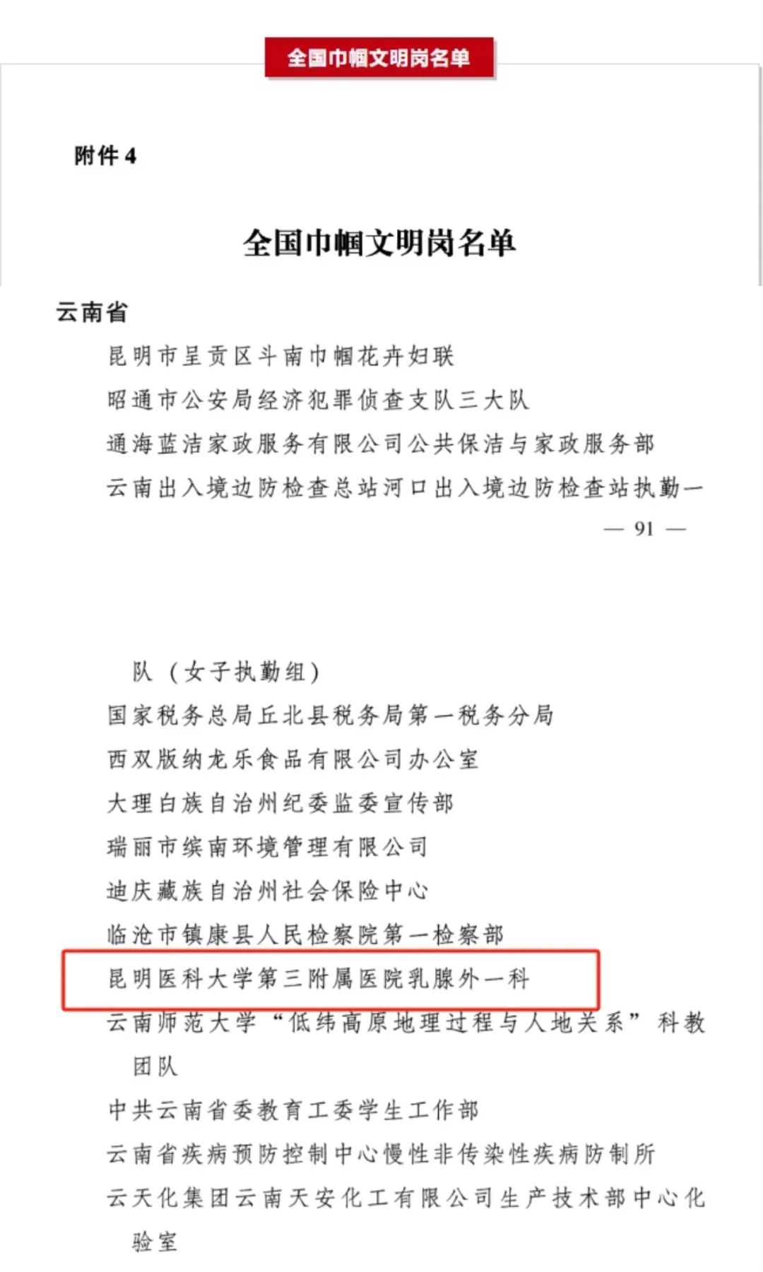 此次bat365在线平台第三附属医院乳腺外一科荣获“全国巾帼文明岗”,彰显了医院巾帼团队的时代风采,她们以白衣为甲、以专业为刃,在守护患者健康的征程上书写了动人篇章。希望全体医务工作者以此为榜样,始终将过硬的医疗质量和优质的医疗服务作为工作的根本,立足岗位,为推动云南省医疗卫生事业发展贡献力量。