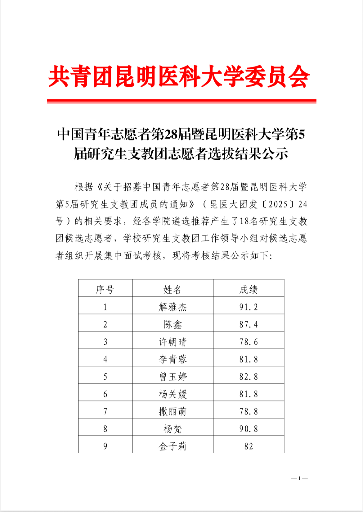 中国青年志愿者第28届暨bat365在线平台第5届研究生支教团志愿者选拔结果公示