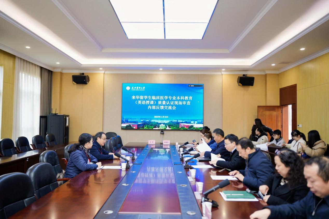 11月19日上午,现场审查认证专家组召开现场审查内部反馈交流会。李利华、何永文,相关职能部门负责人和国际教育学院相关人员参加会议。专家组对bat365在线平台来华留学生临床医学专业本科教育(英语授课)工作给予了充分肯定,认为学校高度重视来华留学教育工作,来华留学生临床医学专业本科教育(英语授课)充分发挥地缘优势,主动服务和融入国家发展战略,办学定位精准;重视生源国医学委员会认证工作,学校国际影响力得到有力提升;重视专业的课程和教材建设,教育教学质量稳步提高;重视“感知中国”文化和社会实践体验,文化育人培养知华友华校友成效显著。同时,认证专家也对学校在全英文师资队伍建设、学生创新能力和胜任力培养、招生工作、管理体系等方面提出了改进的意见建议。