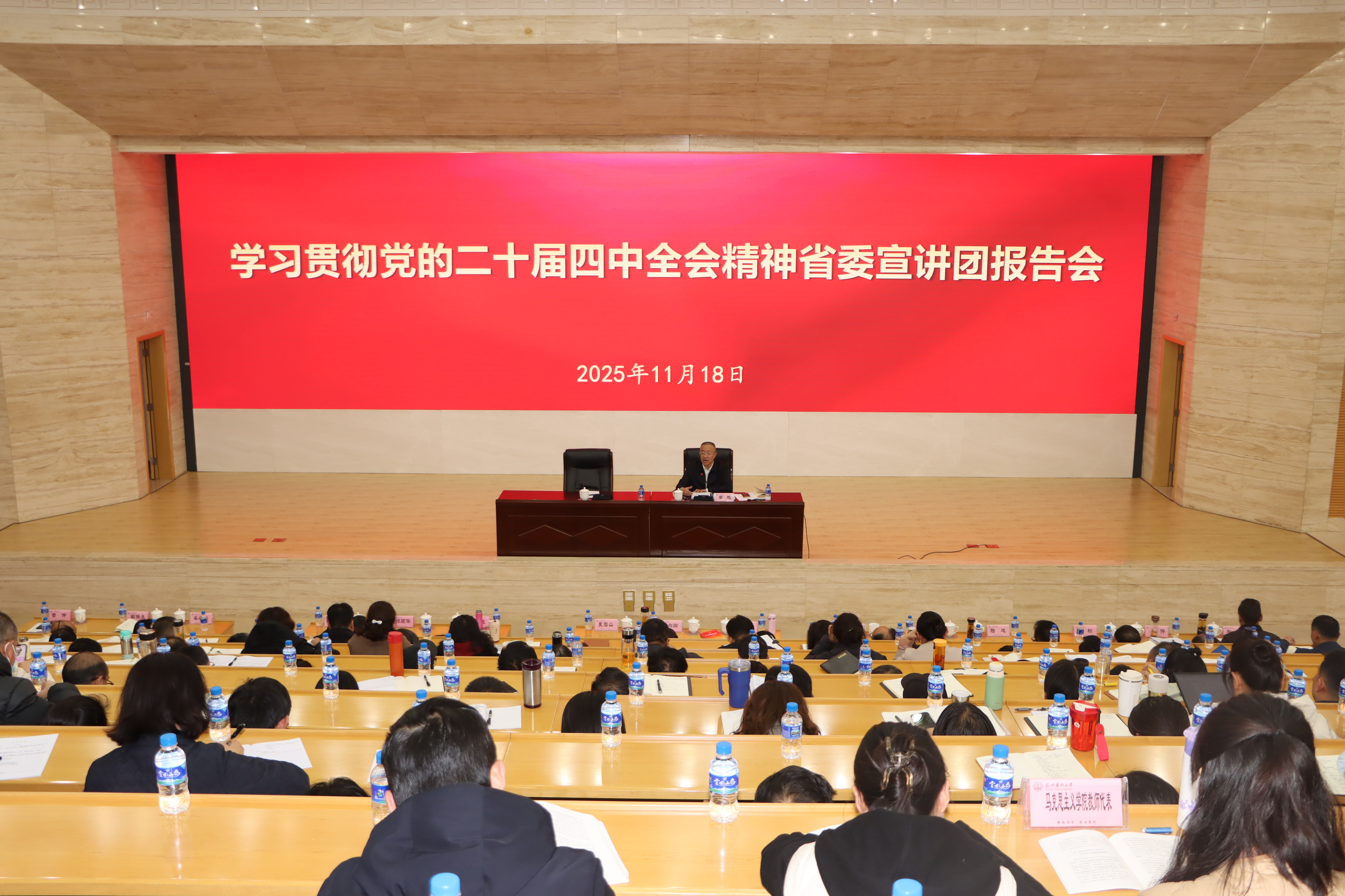 11月18日,学习贯彻党的二十届四中全会精神省委宣讲团报告会在我院举行,省委宣讲团成员,省卫生健康委员会党组书记、主任姜旭作宣讲报告。学校党委书记尹向阳主持报告会。学校党政领导班子成员、其他省管领导干部,副处级以上领导干部,马克思主义学院教师代表,师生党员代表共计280余人参加报告会。