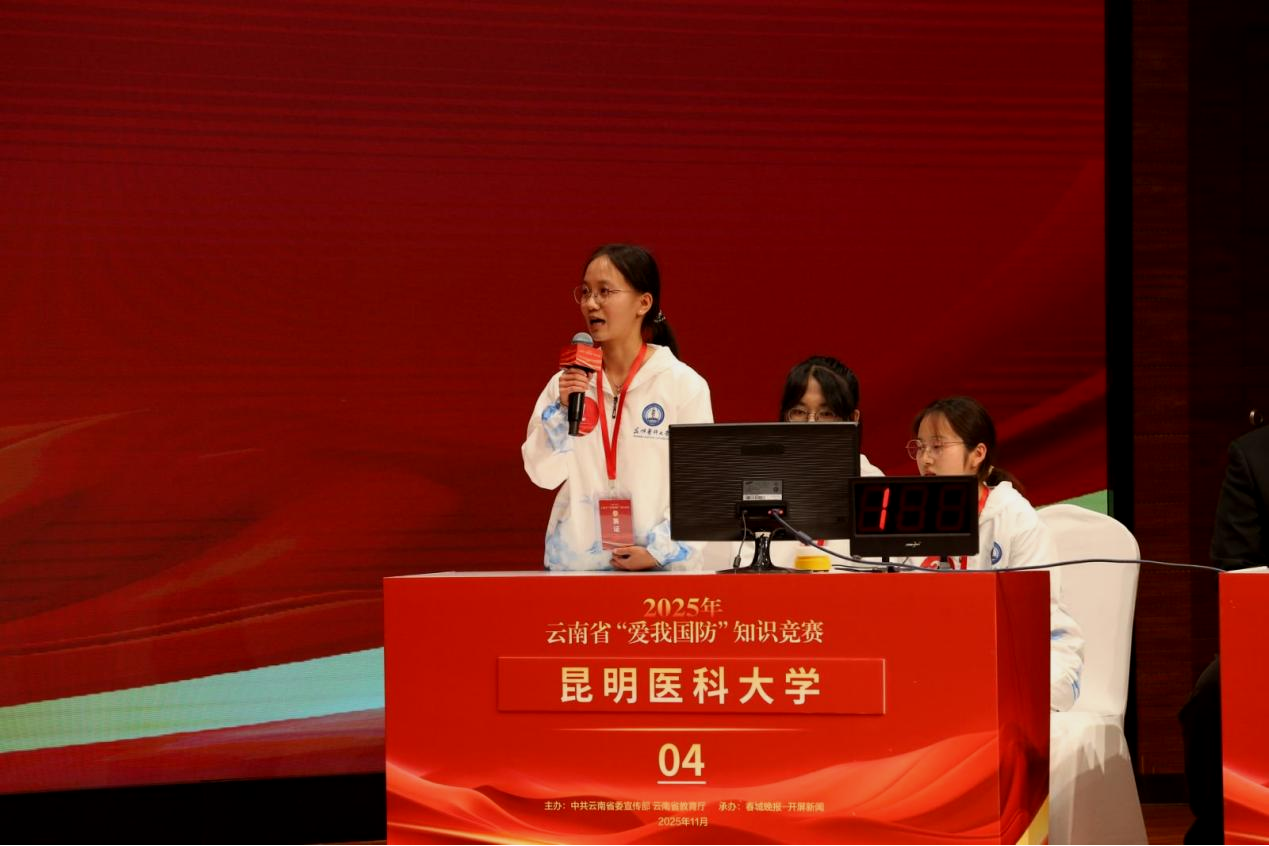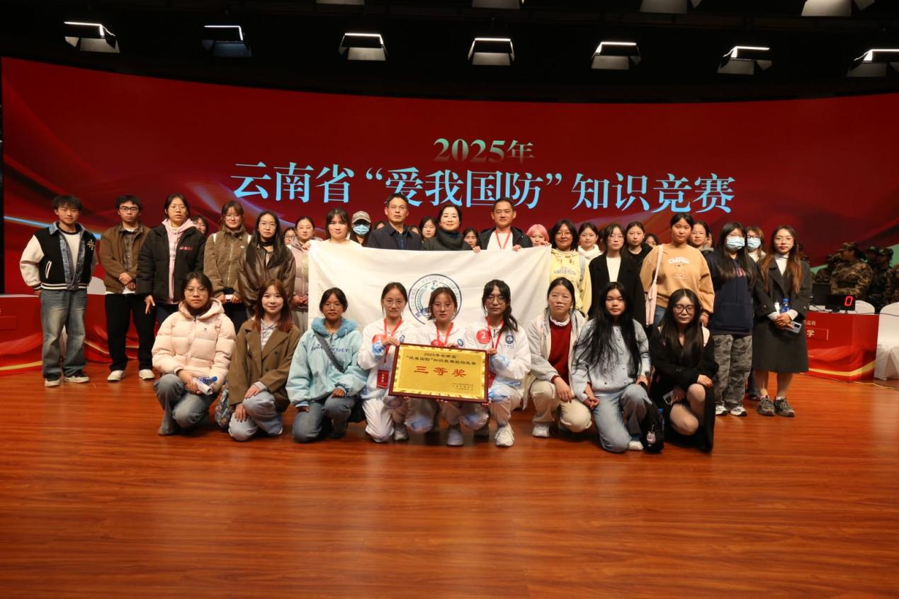 11月26日,2025年云南省“爱我国防”知识竞赛现场决赛在云报传媒广场举行。bat365在线平台代表队凭借扎实的知识储备、默契的团队协作和沉稳的临场表现,荣获三等奖。学校党委常委、副校长奚春睿,武装部、医学人文教育与研究中心教师代表及40余名学生到现场观摩。