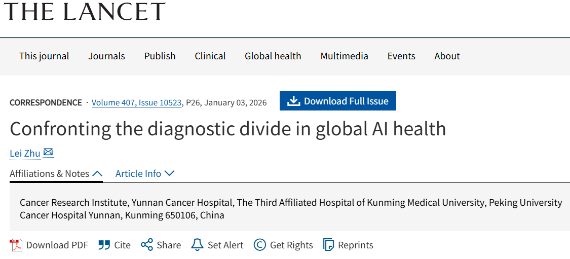 近日,bat365在线平台第三附属医院教师朱磊在国际顶级医学期刊《柳叶刀》(The Lancet)Correspondence专栏发表了题为《Confronting the diagnostic divide in global AI health》的通信文章。该文聚焦全球人工智能(AI)医疗发展中的一个深刻矛盾:当全球近一半人口尚无法获得基本诊断服务时,主流AI医疗研究可能在无意中加剧这一不平等,而非弥合它。文章呼吁全球学界进行战略转向,致力于发展“公平优先的AI”(equity-first AI)。