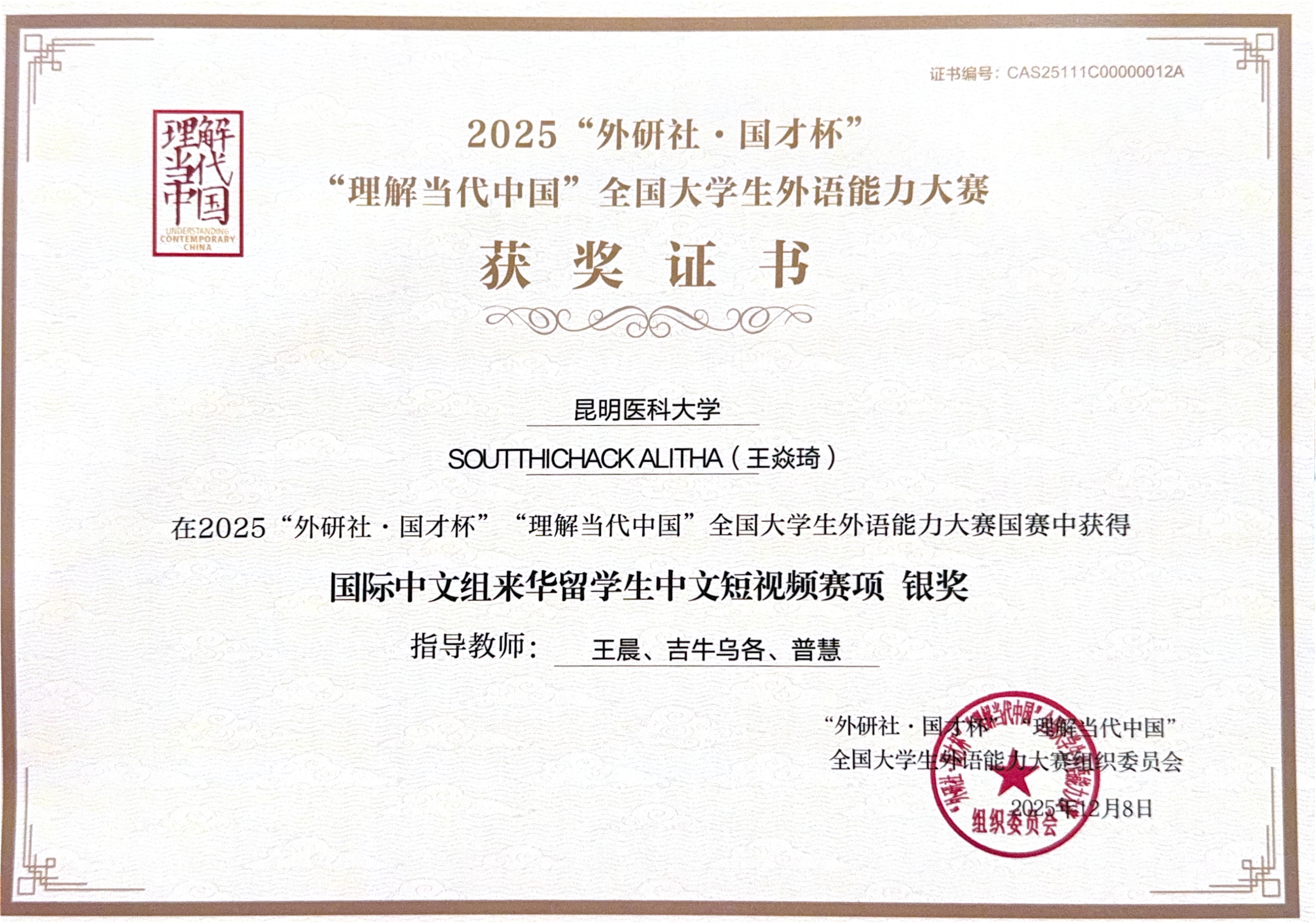 近日,2025年外研社·国才杯“理解当代中国”来华留学生中文短视频大赛全国总决赛在北京落幕。bat365在线平台留学生参赛作品荣获全国总决赛银奖1项、省级金奖1项、省级银奖8项,学校是云南省获奖数量最多的高校。